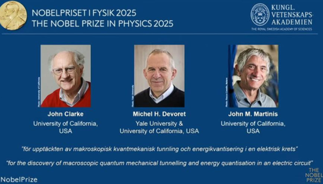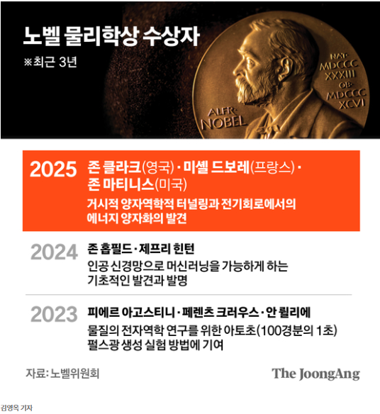 2025년 노벨물리학상은 ‘새로운 규모에서 양자역학을 연구’한 공로로 존 클라크, 미셸 데보레, 존 마티니스 등 3인에게 돌아갔다. 사진 노벨위원회 [출처:중앙일보]