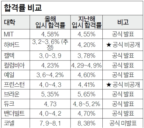 하버드와 프린스턴은 올해부터 합격률 통계를 공식 발표하지 않는다. 두 학교 모두 2년 연속 공식 비공개 방침을 유지하고 있으며, 하버드의 경우 2026년 10월 연방 교육부 제출 후에야 정식 수치가 공개된다.