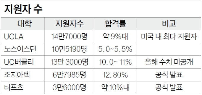 UCLA의 지원자수 공식 발표는 147,000명이지만 UC버클리는 공식 수치가 발표전이다. 다만 지난해는 공식적으로 12만6843명이 지원했다.