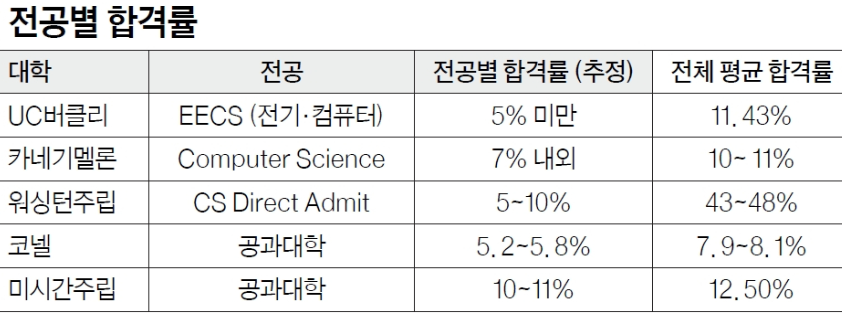 이제 입시는 ‘대학 단위 경쟁’이 아니고 전공 단위 경쟁으로 달라졌다. 특히 컴퓨터 사이언스, 엔지니어링, 프리메드 계열은 같은 대학 내에서도 합격률이 전체 평균의 절반 이하로 떨어지는 경우가 많다. <표-전공별 합격률 참고 〉