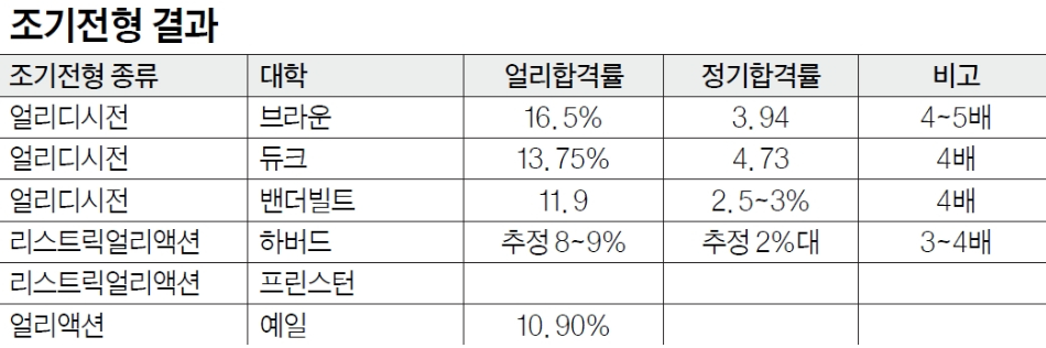 올해 입시 지원에서도 조기 전형(얼리디시전/얼리액션)은 핵심 전략 사항이었다. 다만 반드시 알아야 할 구분이 있다. ‘ED(얼리디시전)’와 ‘REA(리스트릭얼리액션)’은 같은 조기 전형이지만 결과는 크게 다르다. <표-조기전형 결과 참고〉