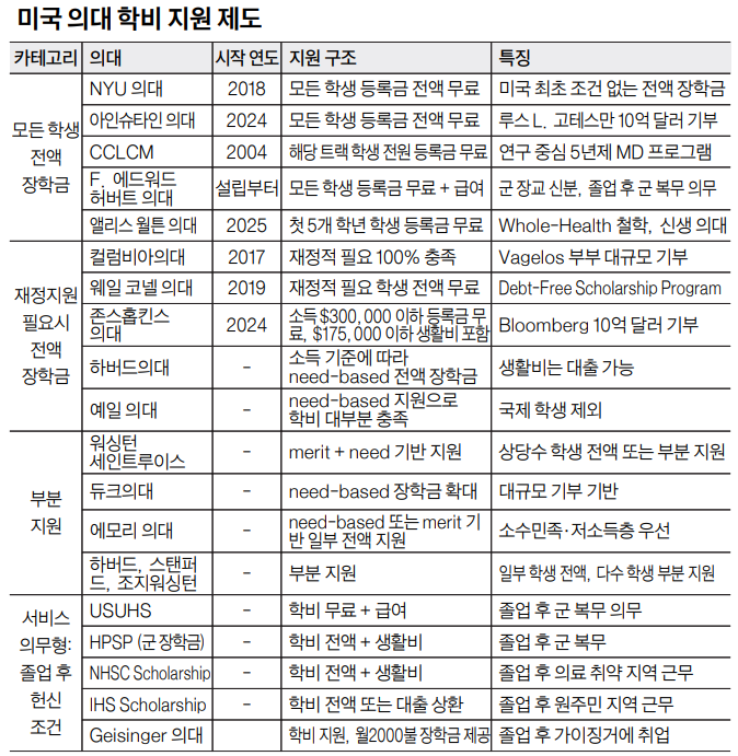 (3)존스홉킨스 의대(Johns Hopkins School of Medicine): 2024년 블룸버그 자선재단(Bloomberg Philanthropies)의 10억 달러 기부로 가계 소득이 30만달러 이하 가정 학생에게 등록금 전액, 가계 소득이 17만5000달러 이하 학생에게는 생활비까지 포함한 지원을 시작했다. 미국 의대 중 가장 포괄적인 재정 지원 구조 중 하나다.
