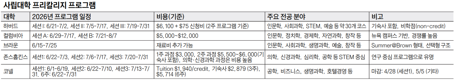 그럼에도 학부모들의 관심은 꾸준하다. 한 교육 컨설턴트는 “미국 대학 입시에서 프리칼리지 경험이 필수는 아니지만, 학생의 학업 역량과 전공 관심을 입증하는 데 도움이 된다”며 “특히 에세이 작성 시 강력한 소재가 될 수 있다”고 설명했다.