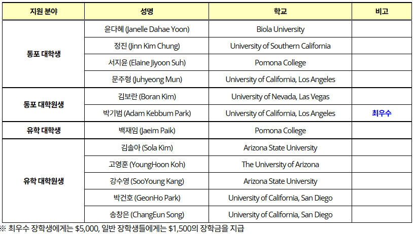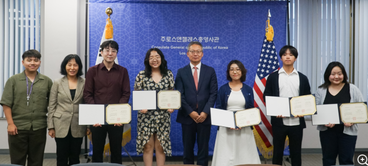 지난 29일 LA총영사관(총영사 김영완)에서는 ‘2025 재미한인장학생 전수식’이 열렸다. 올해 LA총영사관 관할지역에서는 총 12명이 장학생으로 선발됐다. 재미한인장학기금은 1981년 한미수교 100주년을 기념해 한국 정부가 출연한 290만 달러 투자수익으로 운영되며, 올해 전국에서 총 71명을 선발했다. 김영완(오른쪽 네 번째) 총영사가 장학생들과 기념촬영을 하고 있다.