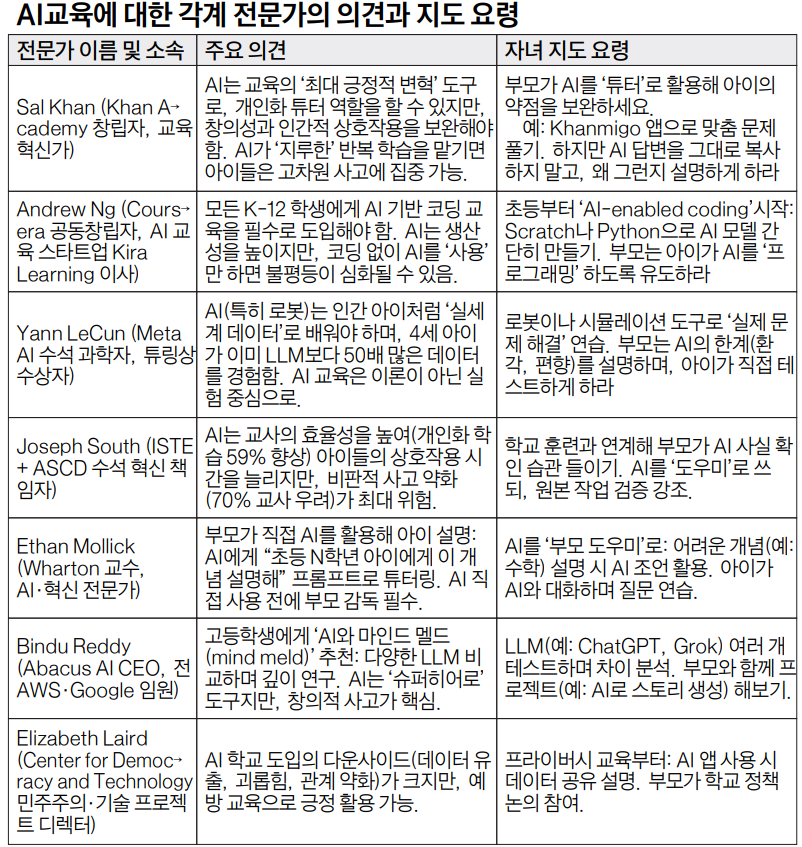 튜링상 수상자인 얜 르쿤은 AI교육은 이론보다는 실험중심이어야 한다는 견해를 밝혔다. 이던 몰럭 와튼스쿨 교수는 부모의 감독이 필수며 부모는 AI를 부모 도우미로 사용해야 한다고 강조했다. 표 참조〉