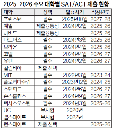 2025년 10월 현재 시점에서 대학 입시는 팬데믹 이후 큰 변화를 겪고 있다. 많은 명문 대학들이 SAT나 ACT 점수 제출을 다시 필수화하며 ‘능력주의(meritocracy)’로의 회귀를 선언했다. 아이비리그 명문 대학이며 US뉴스 선정 ‘전국대학 순위’ 1위인 프린스턴대는 지난 9일, 2027-28학년도 지원자 대입부터 SAT/ACT 점수를 필수로 요구한다고 발표했다. 아이비리그 중 컬럼비아대를 제외한 나머지 7개 대학이 시험 필수 복귀를 완료한 것을 의미한다. 하버드와 예일대는 2025-26학년도부터 ‘test-flexible(제출 융통성)’ 정책으로 SAT, ACT 점수를 제출하지 않더라고 AP또는 IB 시험 점수로 대체 제출이 가능하게 하므로 표준시험 필수 정책으로 회귀했다. 2024년에 지원서를 제출한 다트머스.브라운은 이미 2025학년도부터 필수였고 2026학년부터는 코넬, 유펜도 합류한다. 또한 MIT, 스탠퍼드.존스홉킨스.텍사스대(오스틴) 등도 이미 제출 필수를 재개한 바 있다. 플로리다.조지아 주립대 시스템도 전체적으로 필수화했다.